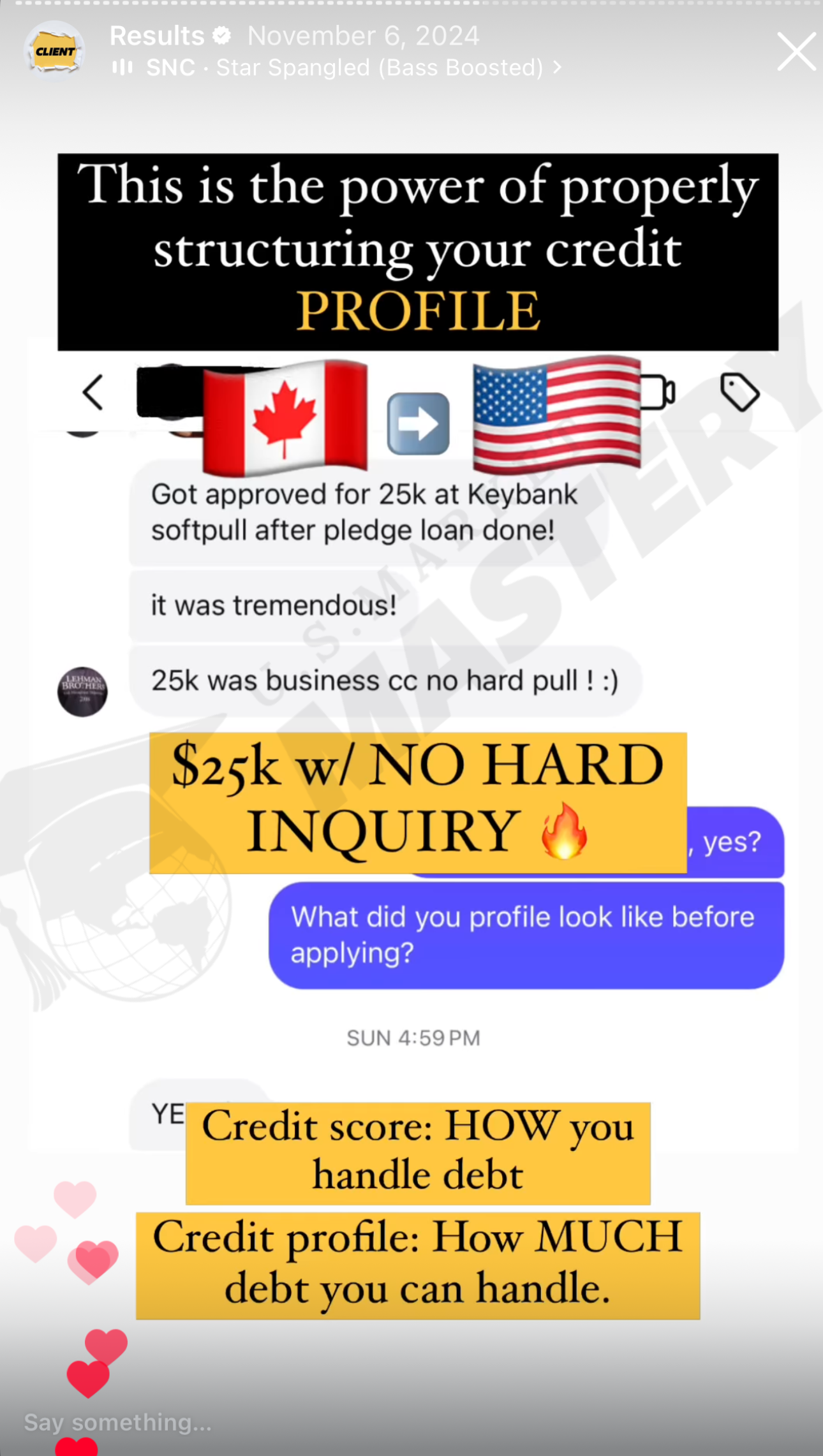 All program materials are intellectual property and protected by copyright. Reproduction or distribution without permission is prohibited.Any testimonials or client results shown are from individuals who followed the strategies provided. Their experiences are not promises of future performance. Many factors affect credit, funding, and financial outcomes, and we cannot predict your specific results.